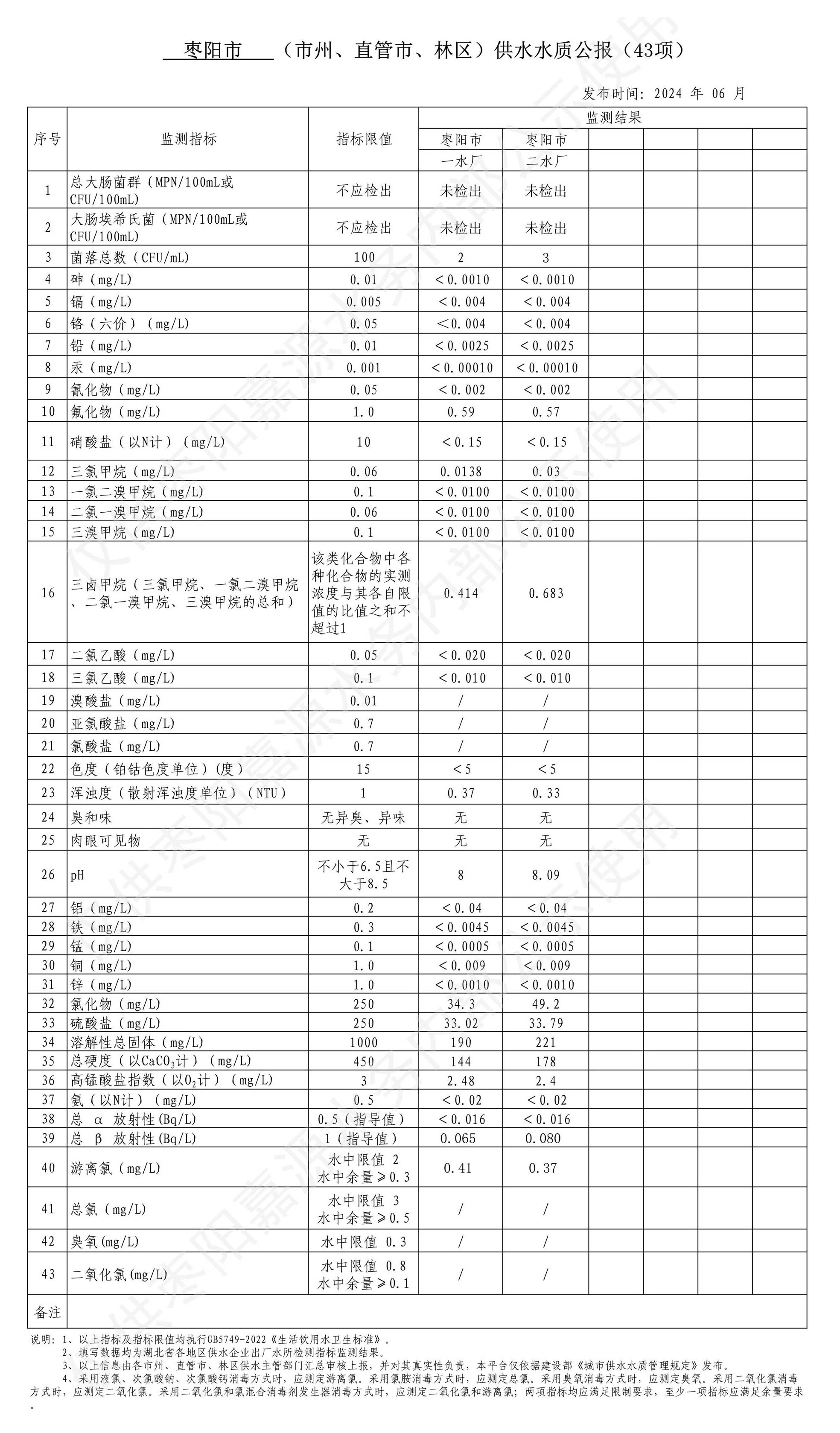 枣阳市嘉源水务有限公司2024年06月供水水质公报