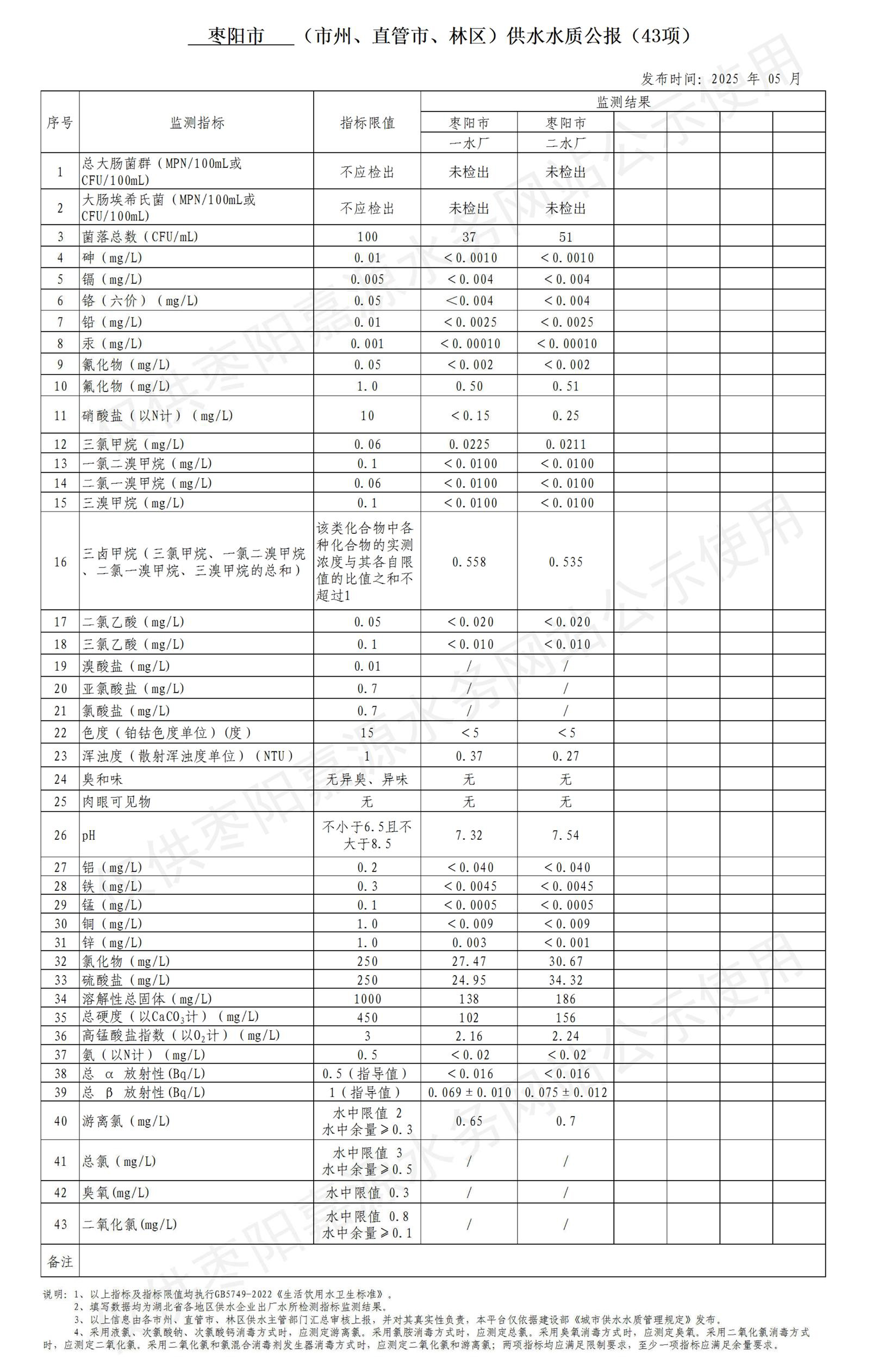 枣阳市嘉源水务有限公司2025年05月供水水质公报