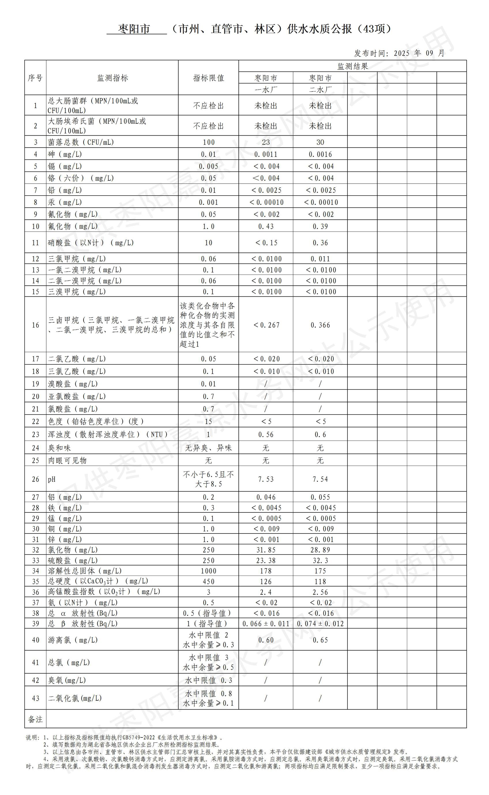 枣阳市嘉源水务有限公司2025年09月供水水质公报