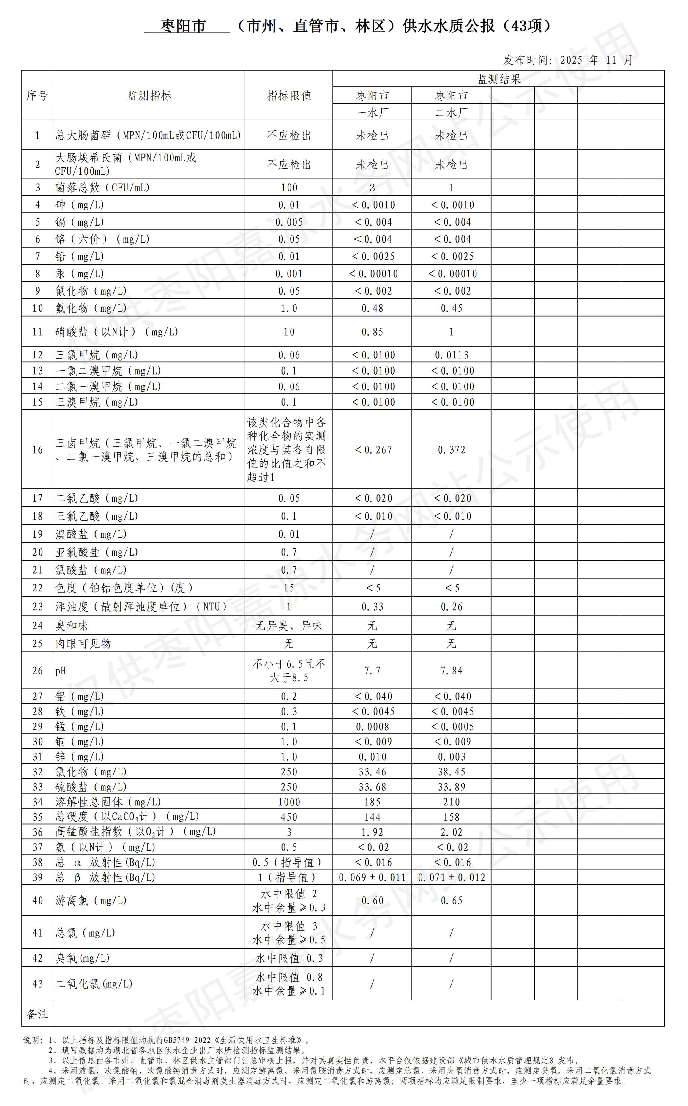 枣阳市嘉源水务有限公司2025年11月供水水质公报