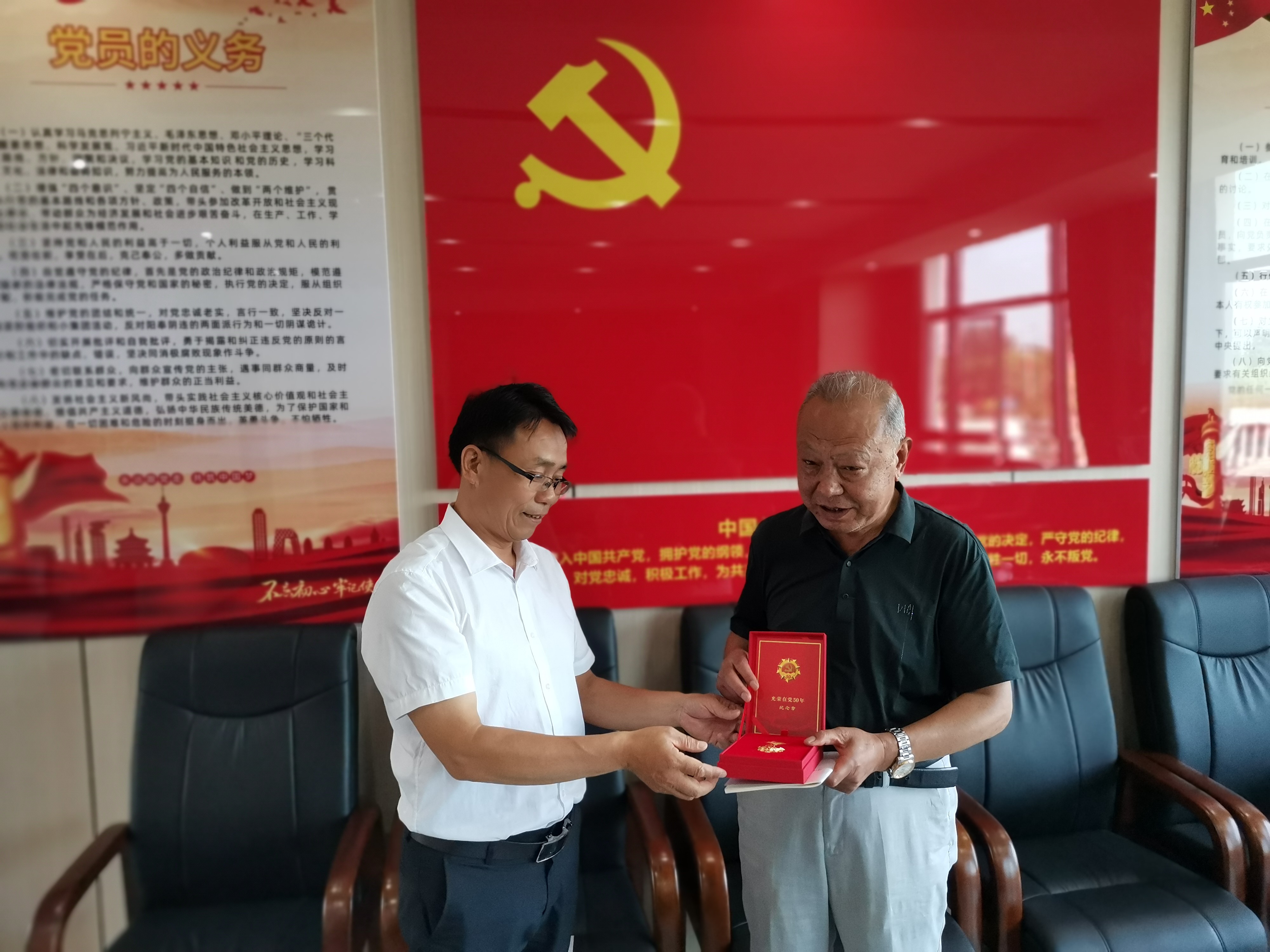 公司党委为72岁老党员、退休军转干部张明连同志颁授“光荣在党五十年”纪念章,赠送新修订的《中国共产党纪律处分条例》读本,感谢其对公司发展所作的贡献,并详细了解张明连同志身体和生活情况。
