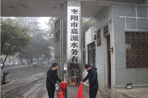 上午9:18,党委书记、总经理张成毅,副书记、副经理张斌共同为新公司揭牌。随着大门右侧门柱上红绸带的落下,“枣阳市嘉源水务有限公司”11个标宋大字跃入眼帘,现场响起热烈的掌声。